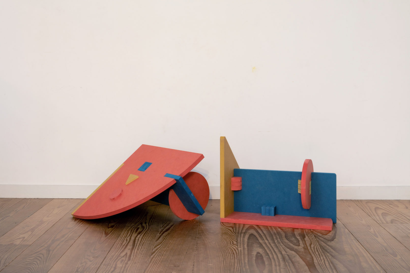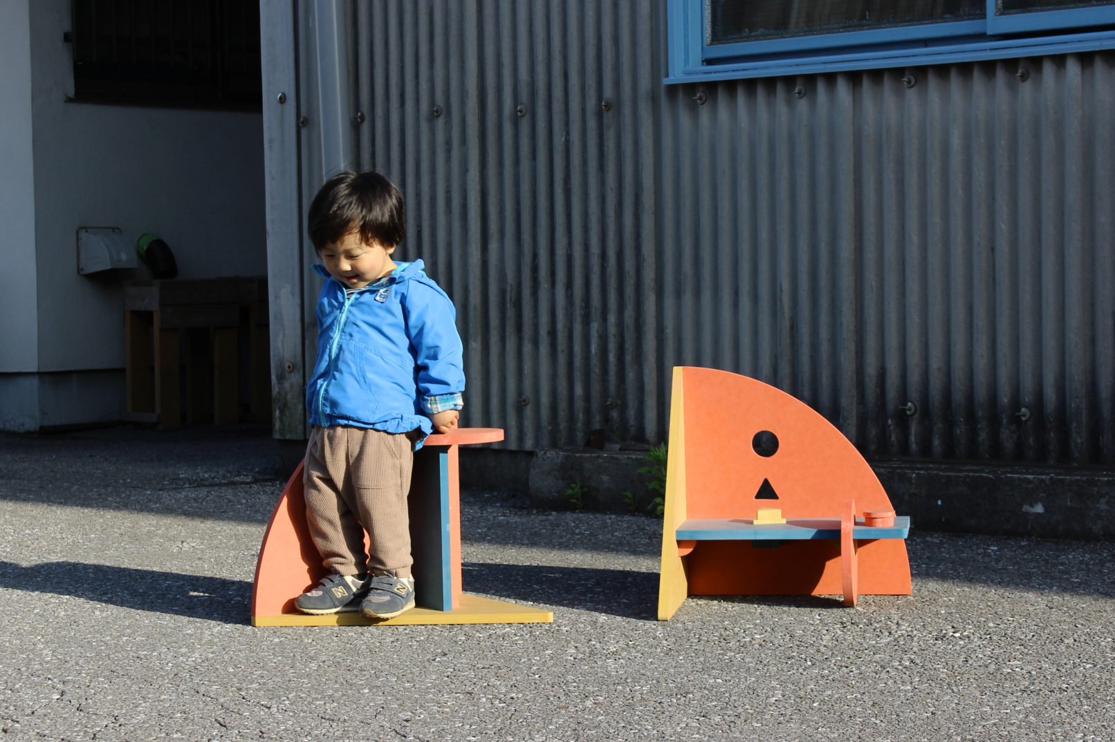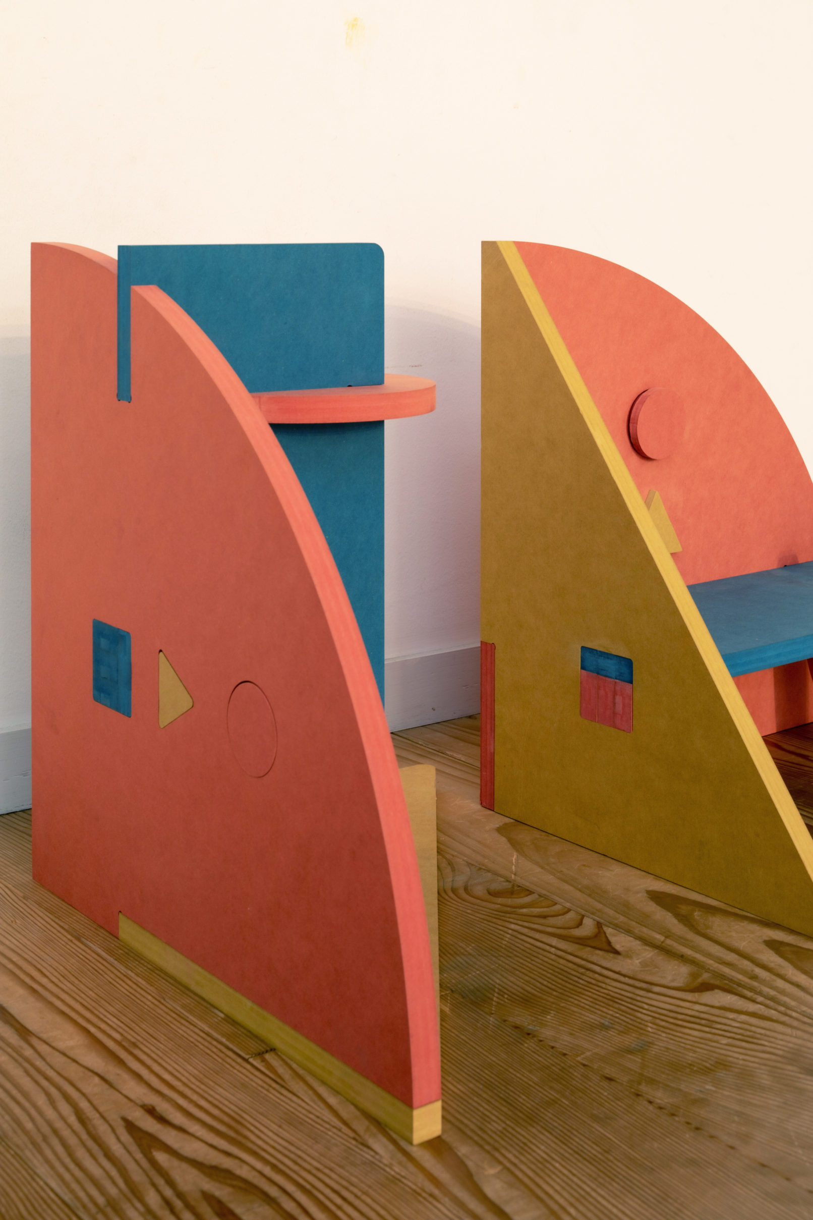 それぞれの図形にカラフルな原色である赤、黄、青を色付けして、家具としても玩具としても遊べるよう大小のパーツを組み合わせた。