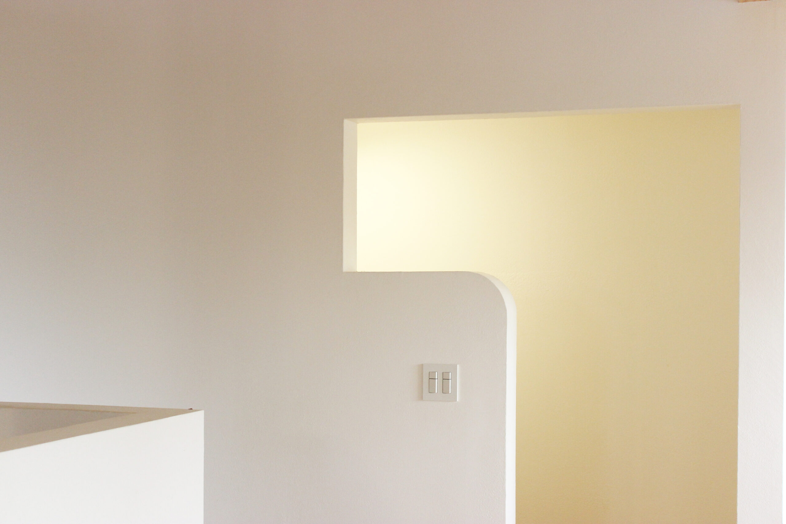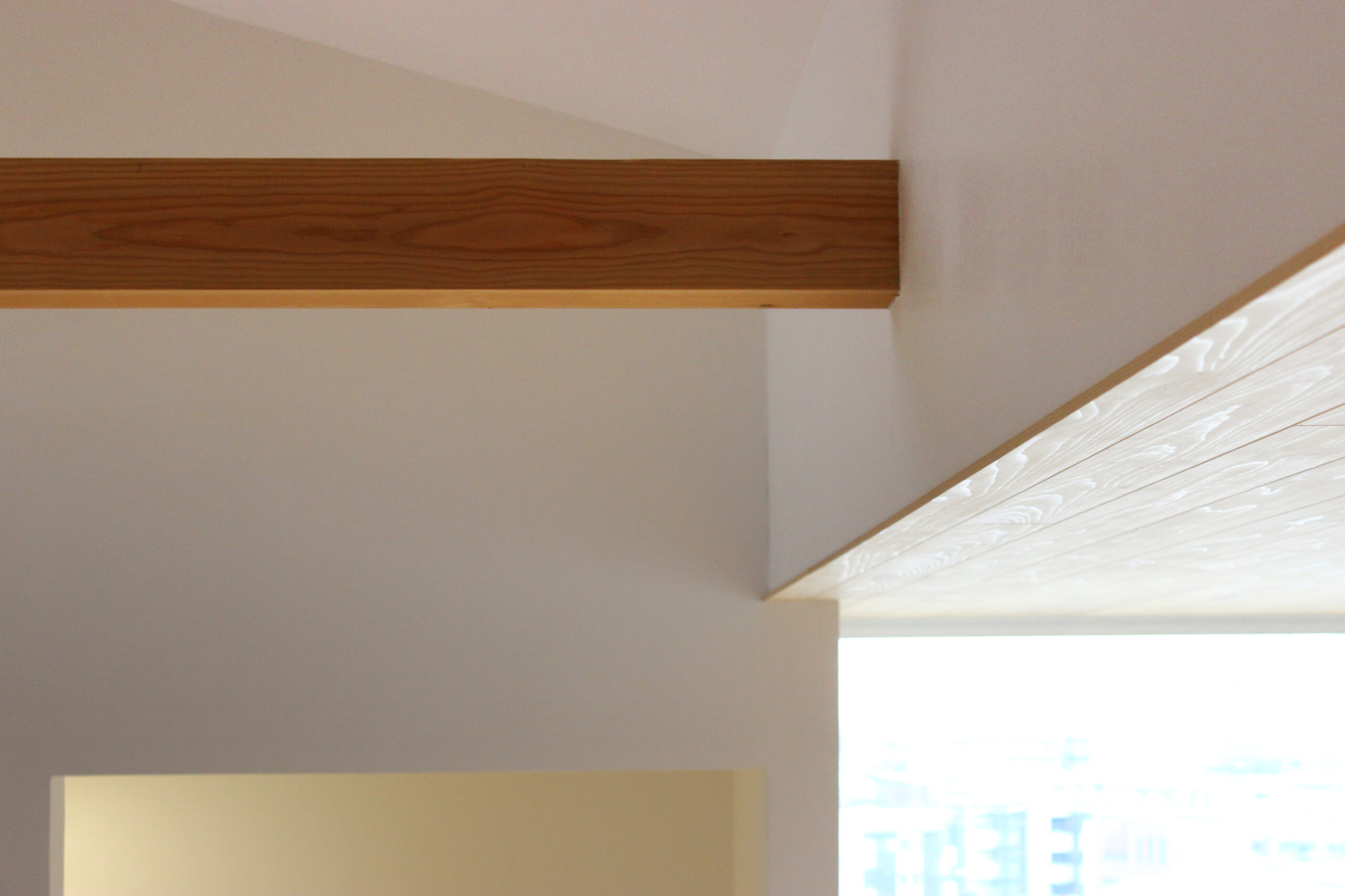 リビングは落ち着きのある空間にするため天井の高さ2.1mに抑え、ダイニングは4mの吹き抜けにし開放感な空間にした。天井の高さや素材を切替えることで強弱のある空間を目指した。