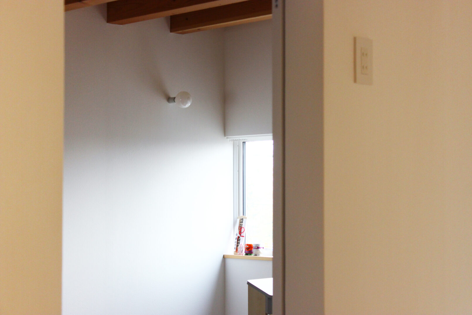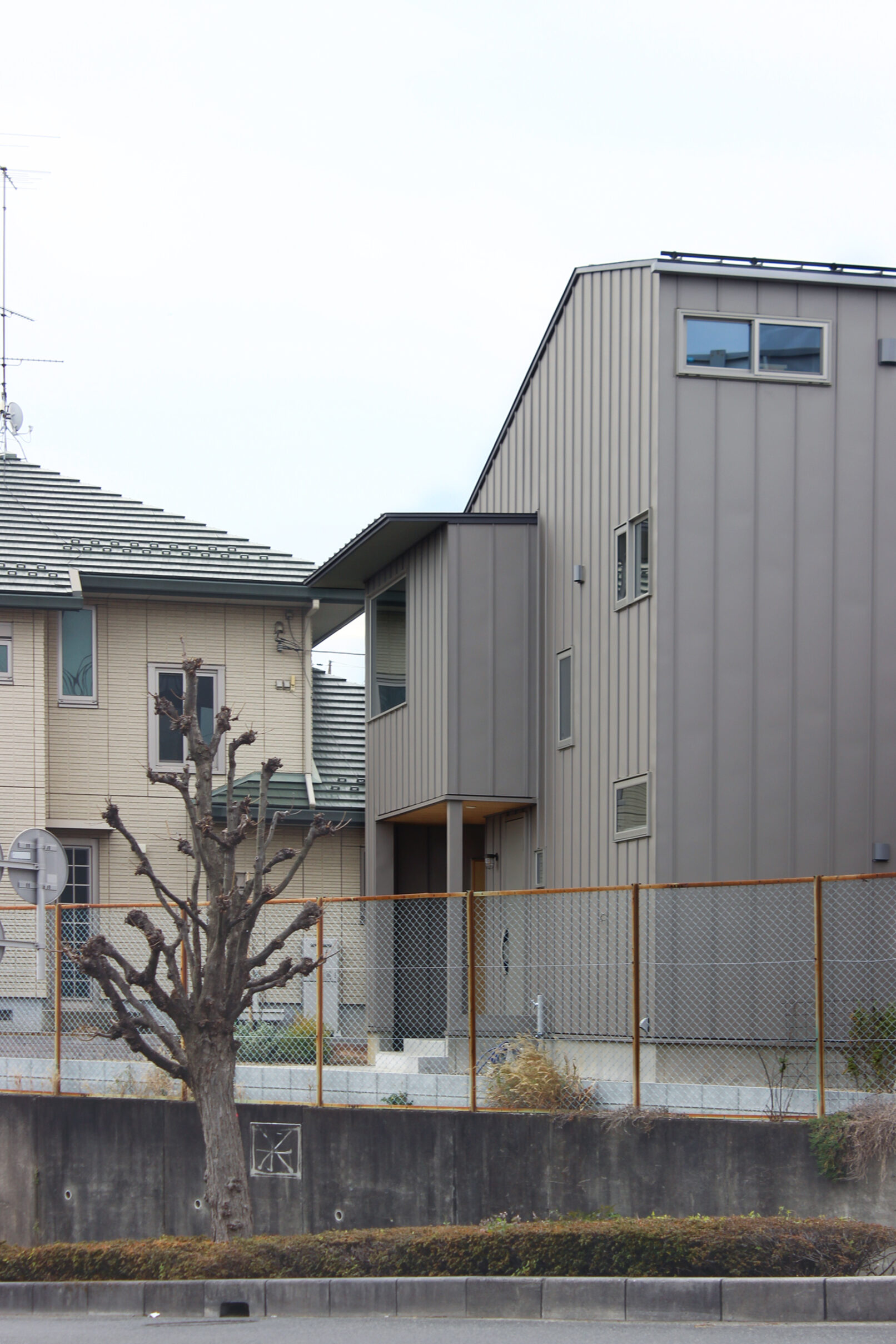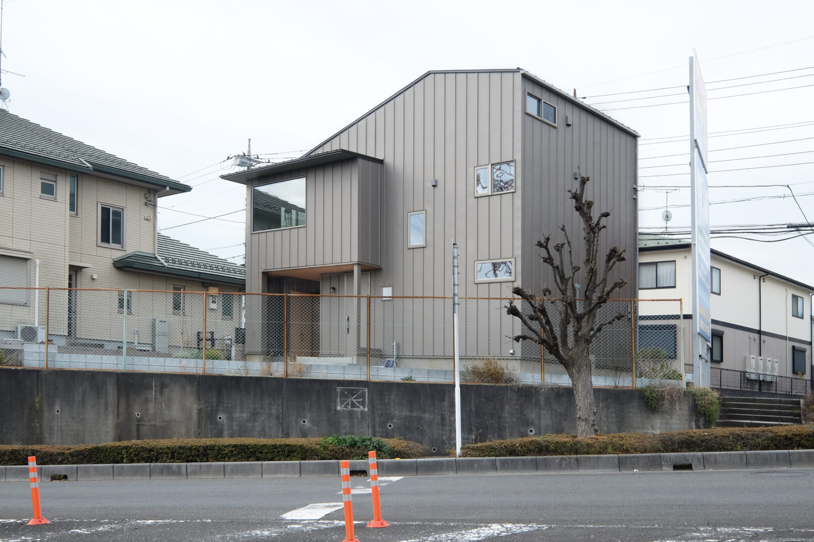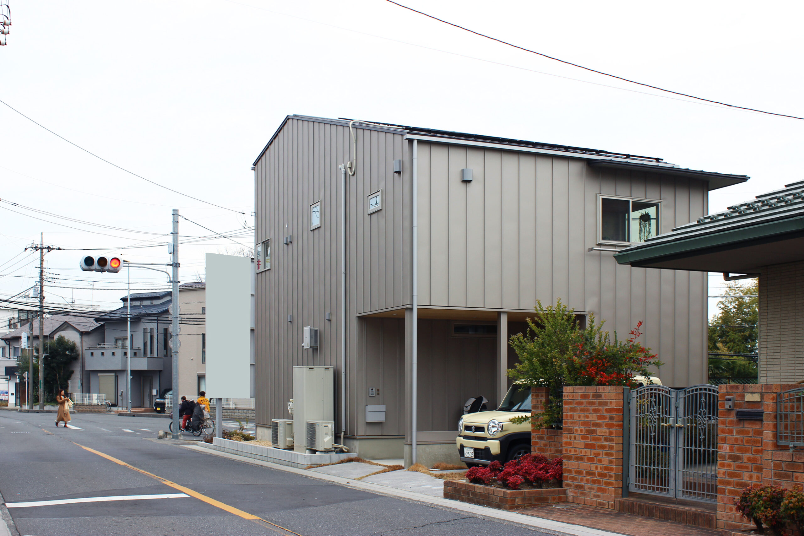 車通りが多いため、家族がよく集まるリビングダイニングを2階に設け、1階は水廻りと夫婦の寝室を計画し、窓を最低限にした。