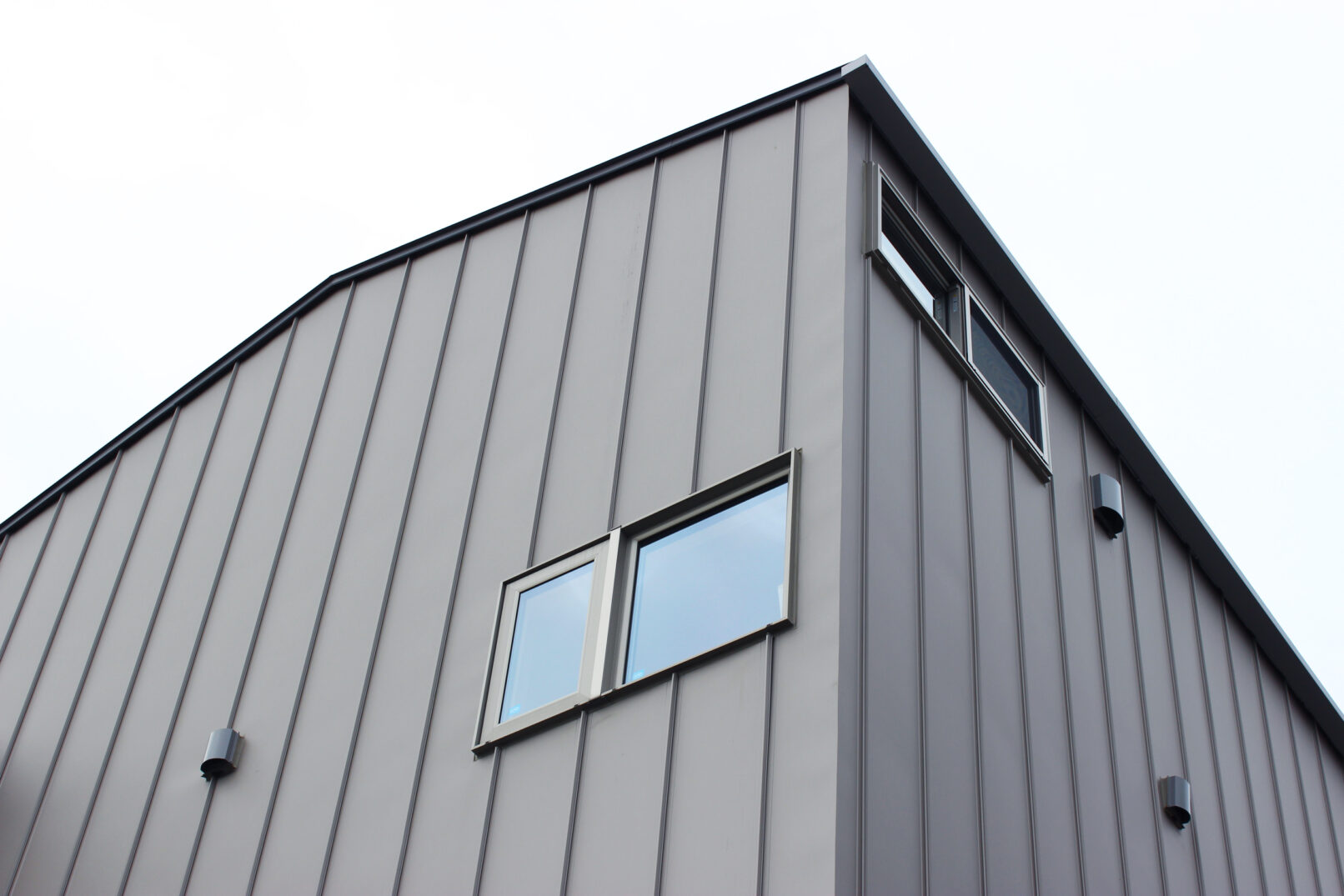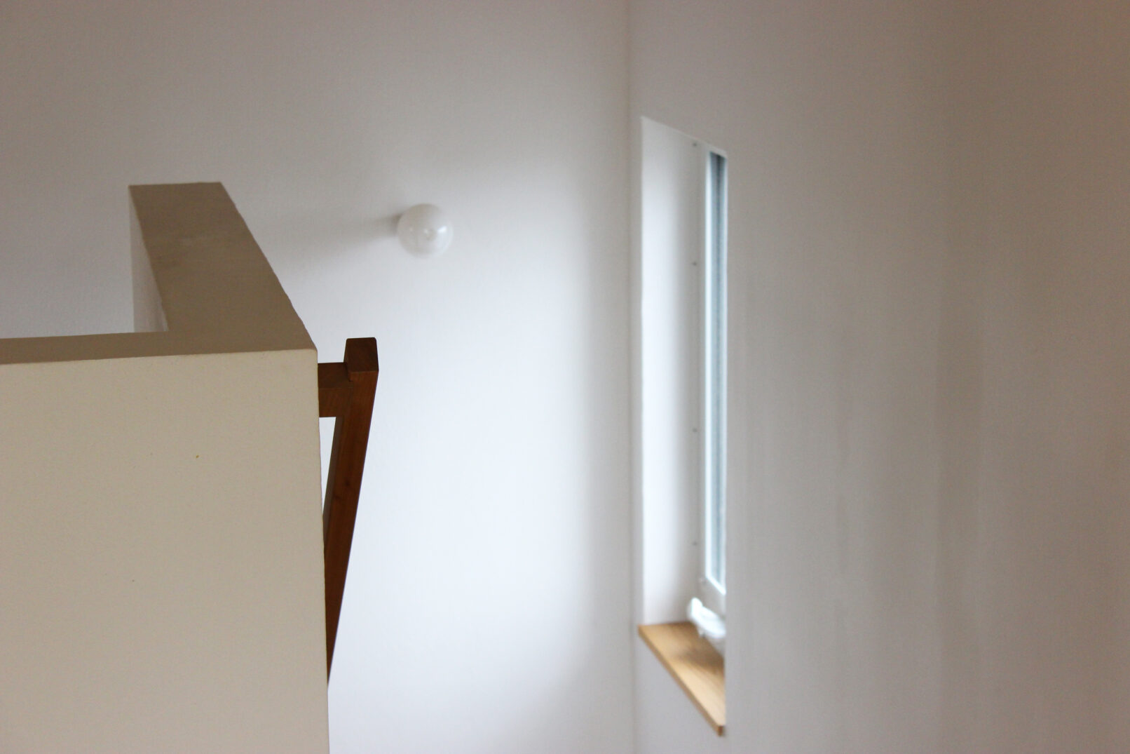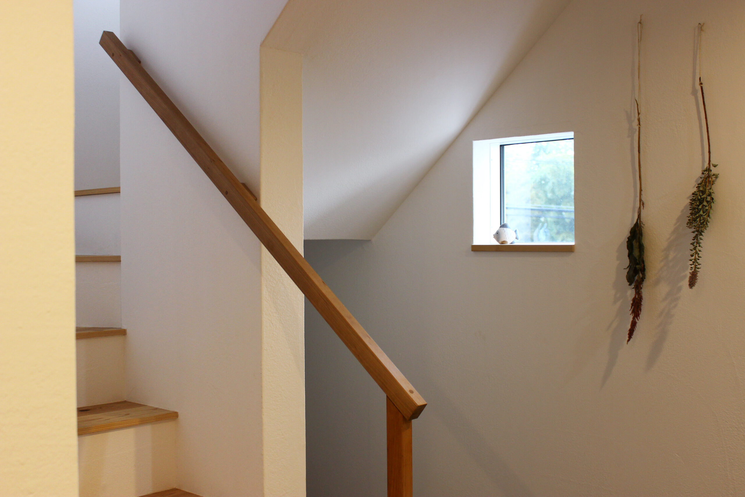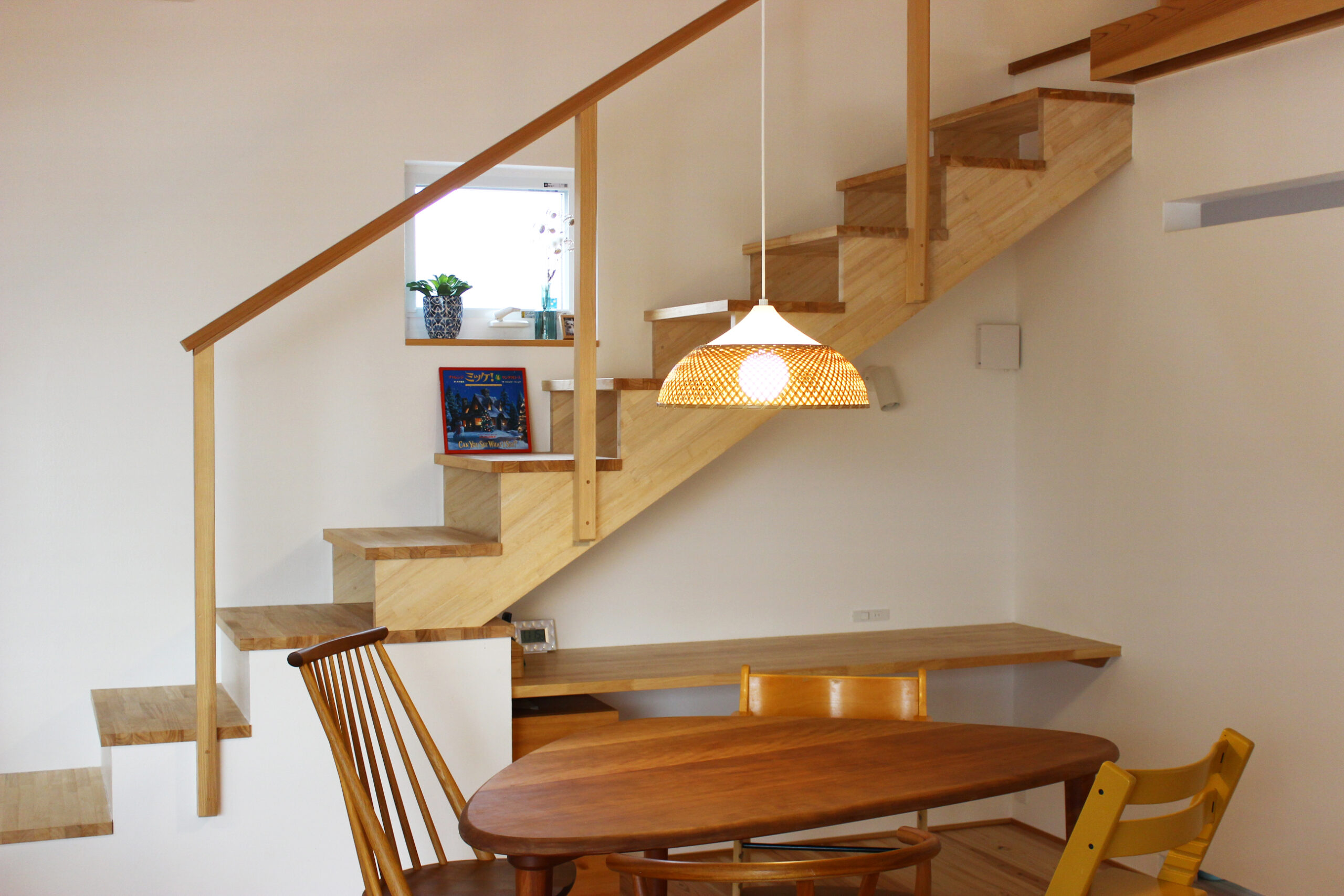 車通りが多いため、家族がよく集まるリビングダイニングを2階に設け、1階は水廻りと夫婦の寝室を計画し、窓を最低限にした。