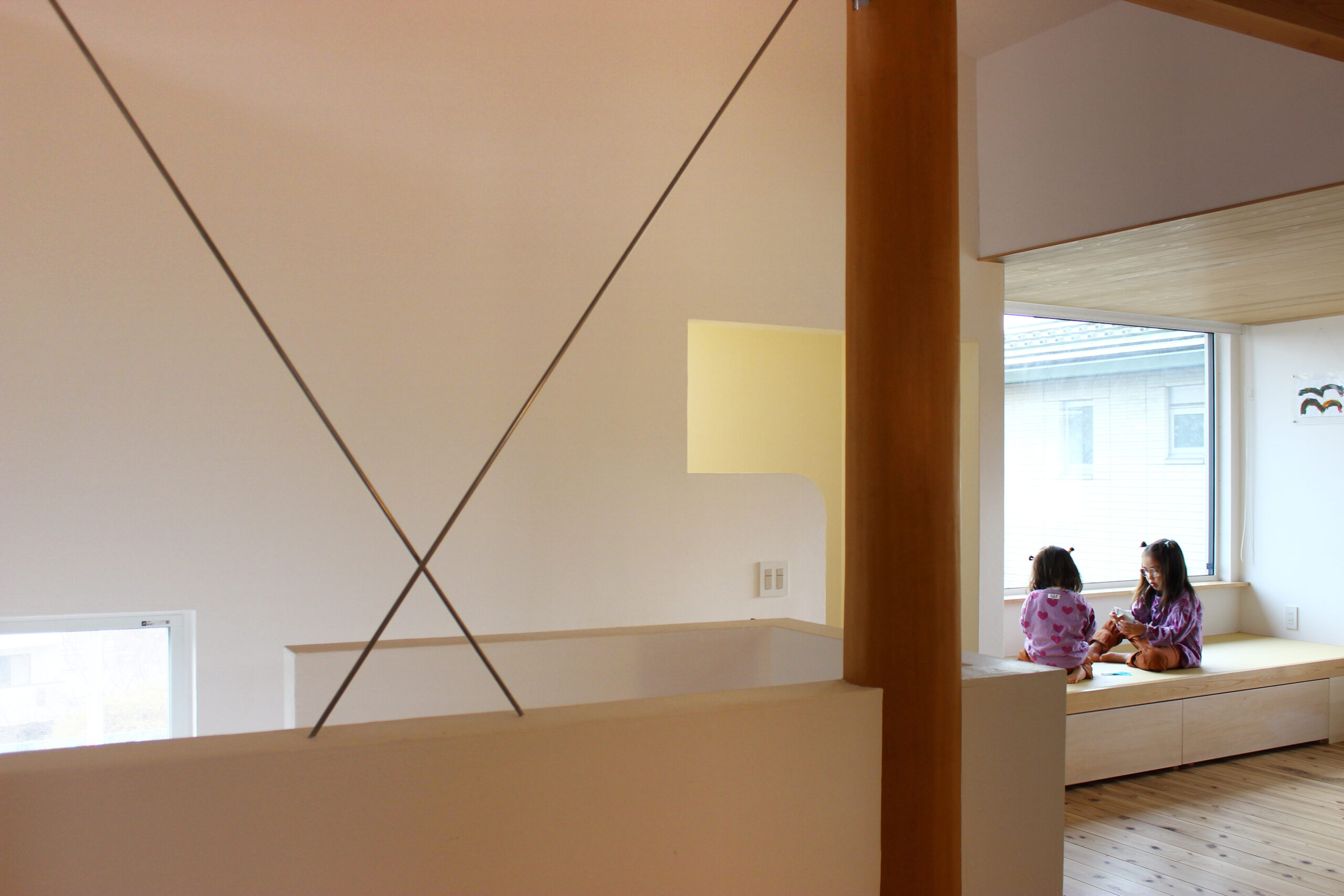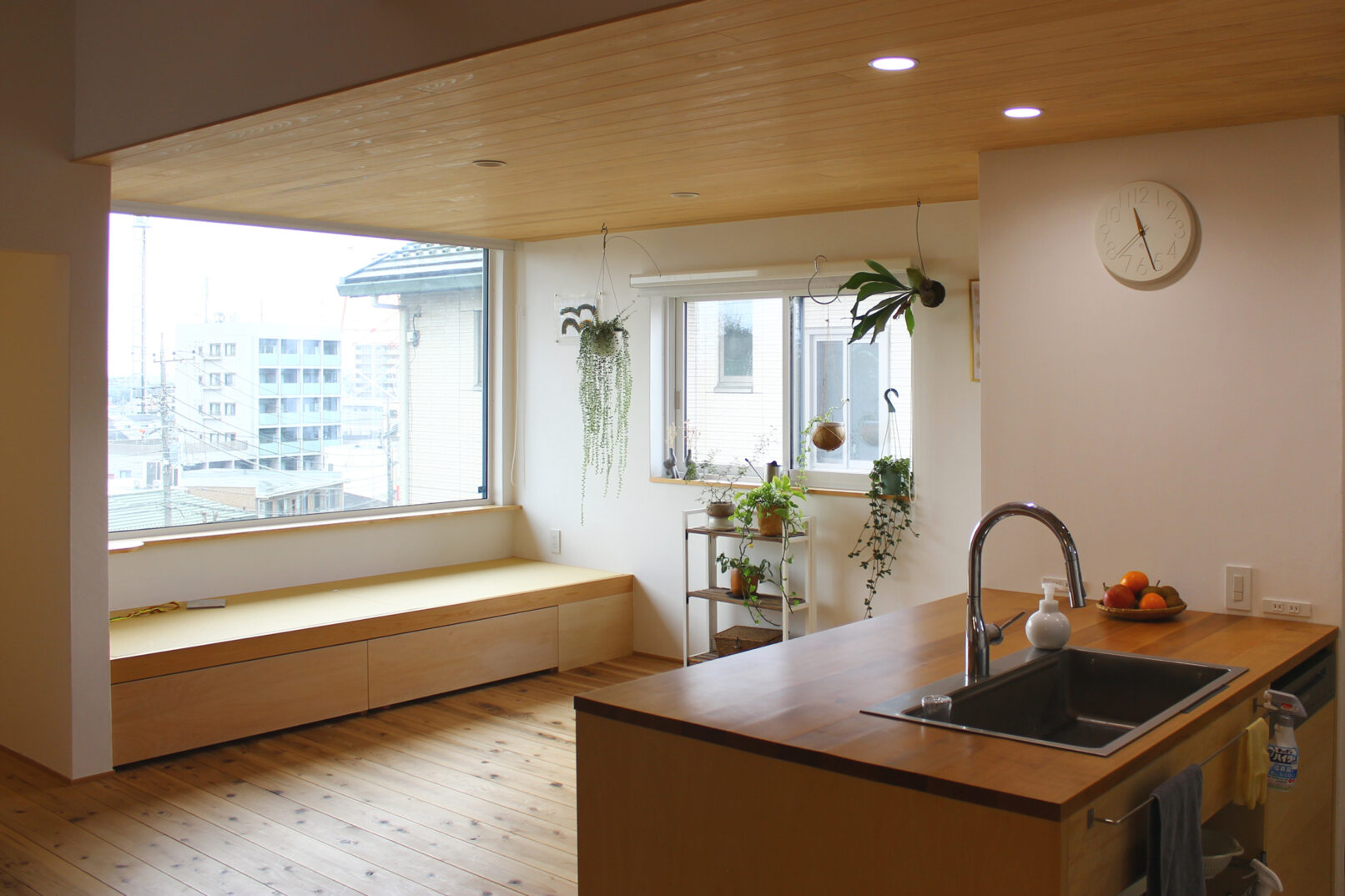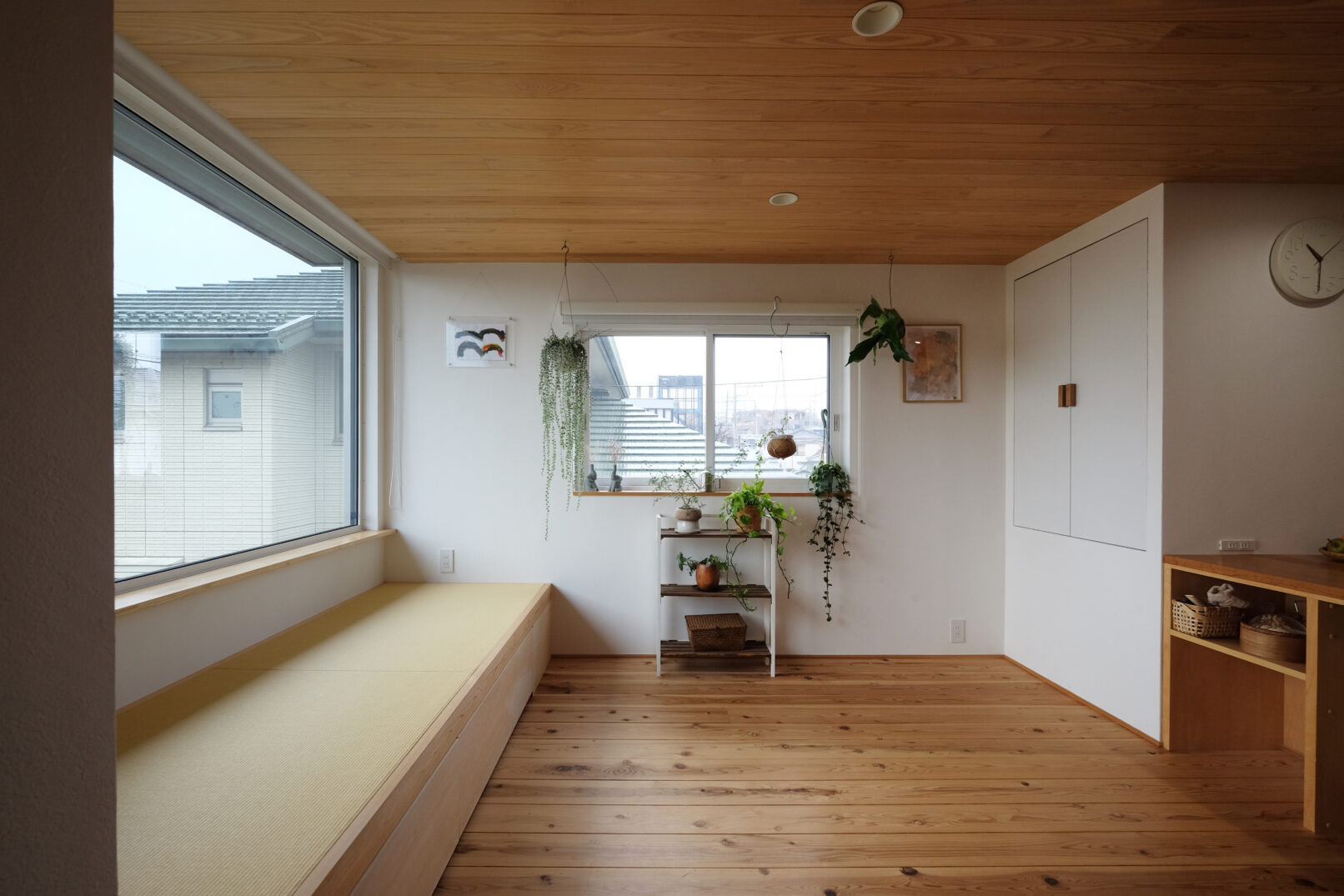 眺望が楽しめるよう筑波山の方角にはくつろげる小上がり空間と大きな窓を設けた。